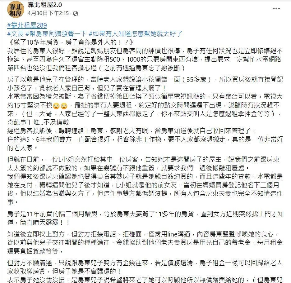 原po表示,房東阿姨人非常好,只要租屋處要修理東西,絕對不會拖延。如果租客住久了,還會主動降租500元,甚至1000元。但先前房東為了讓35歲的兒子獨當一面,因此買房後直接登記在兒子名下,貸款則是自己扛。房東兒子管理租屋處時經常出包,直到有房客受不了投訴原本的房東,老人家才將房子從兒子手中收回管理。