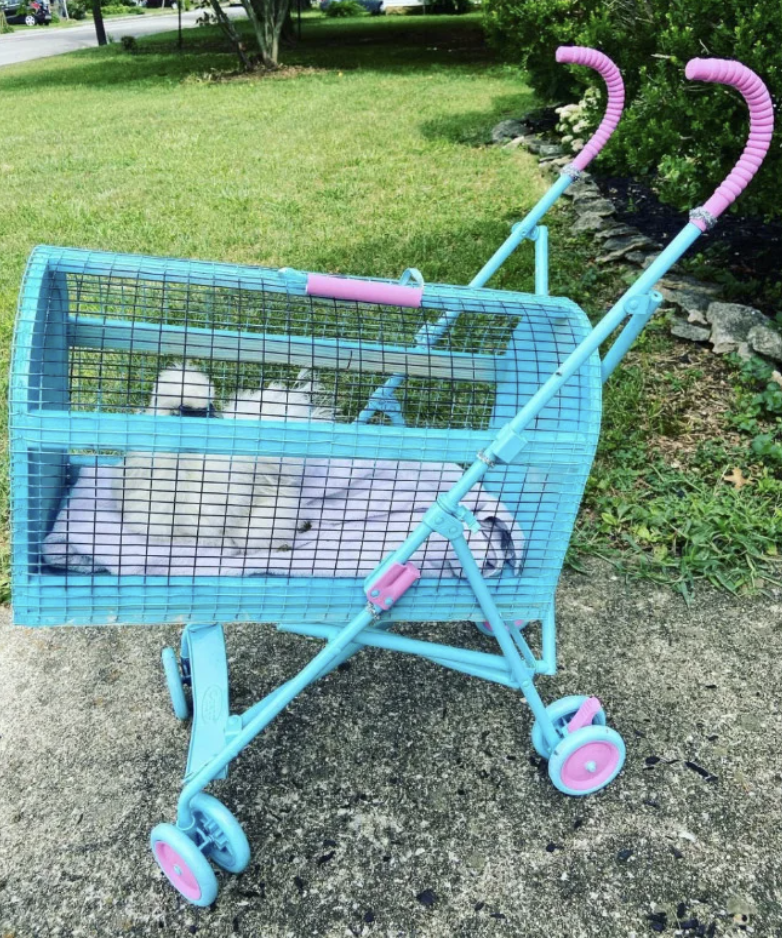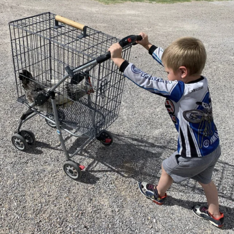 ▼嬰兒車有不同的顏色可選,跟超市的購物車很相似,但車身是封閉的,不用擔心小雞跳出來。飼主可以在嬰兒車底部鋪設稻草,然後推著小雞出門散步,一定非常吸睛。