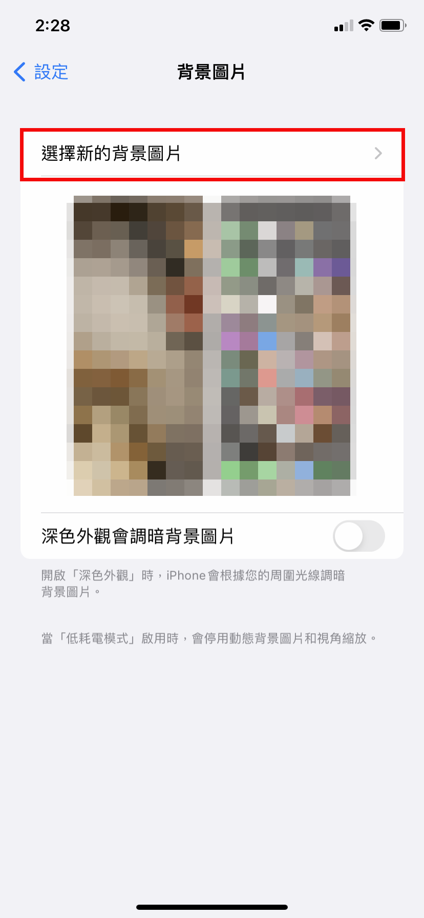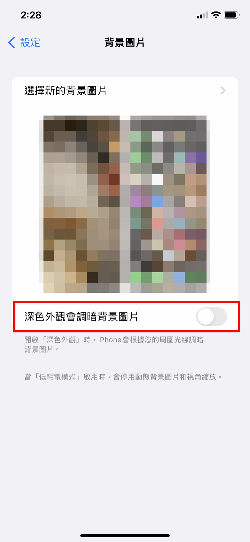 ▼2.進入「設定」>「背景圖片」中,先將「深色外觀會調暗背景圖片」關閉。