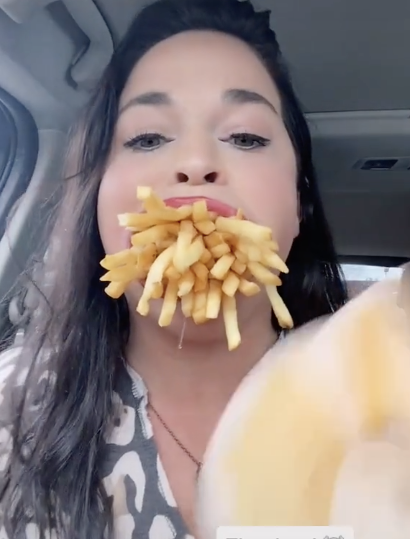 ▼Samantha挑戰一口吞下麥當勞大包薯條: