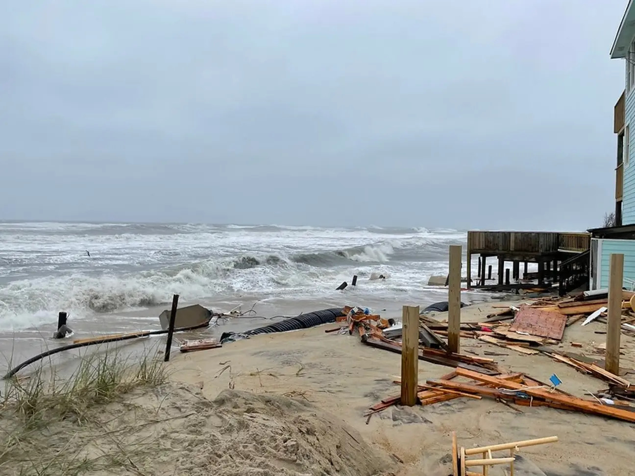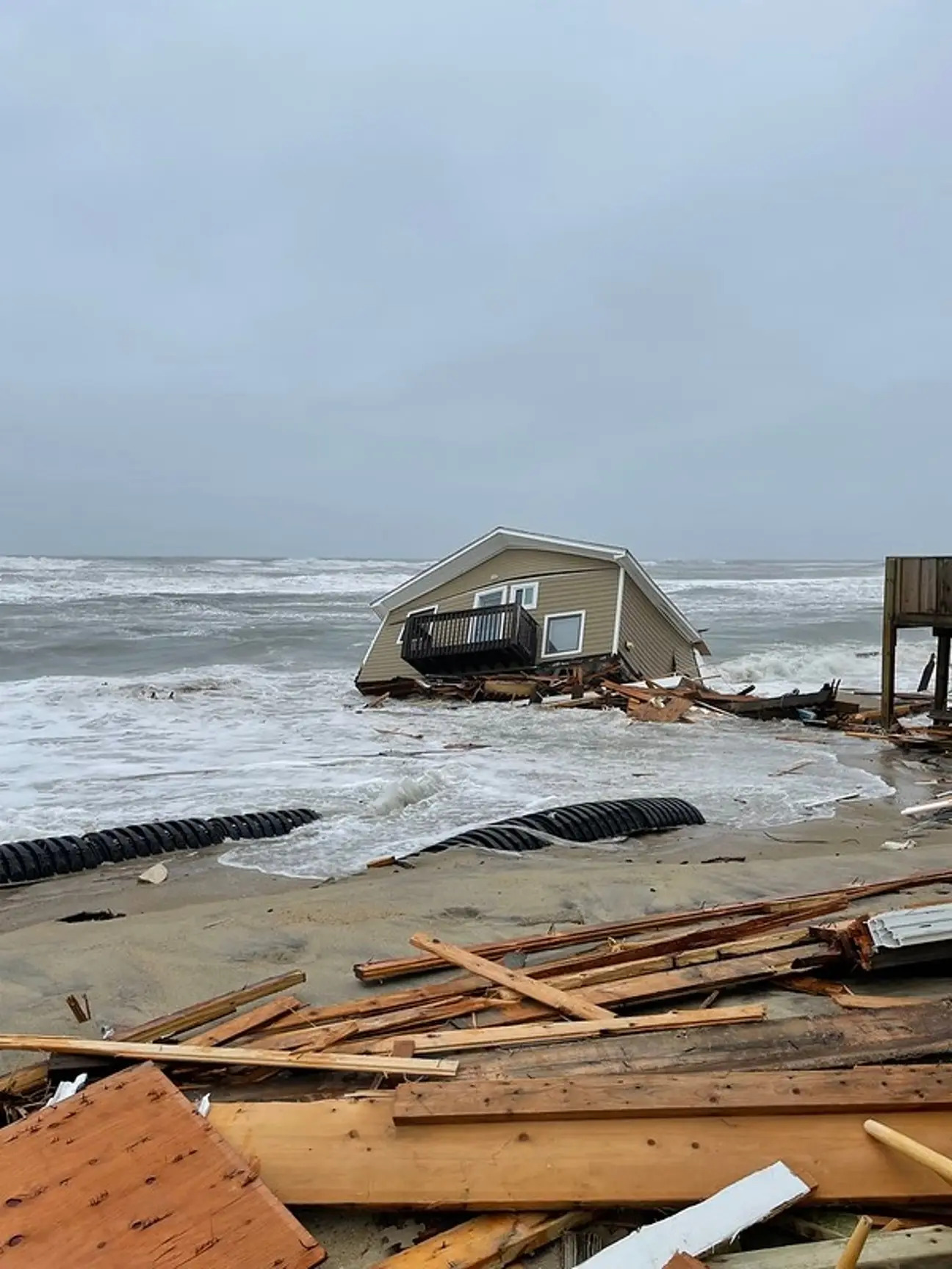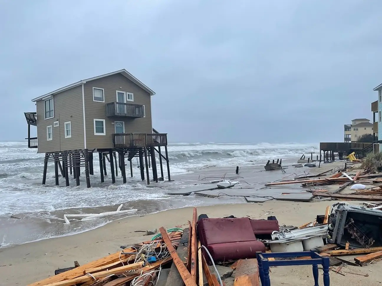 ▼這棟倒塌的房屋位於北卡州哈特拉斯島(Hatteras Island)的羅丹薩(Rodanthe,NC)。從網路上流傳的影片可以看到,海浪衝擊導致支撐房屋的柱子搖搖欲墜,整棟建築很快就掉進波濤洶湧的海洋中。屋外的走廊、陽台、階梯等等也被損毀,一樓的部分外牆被海洋擊穿。