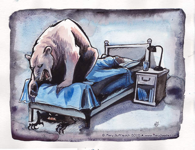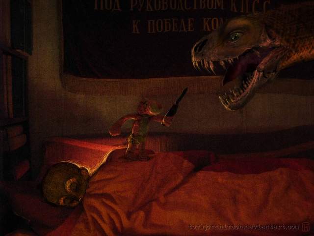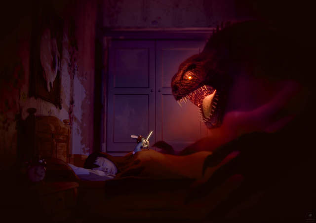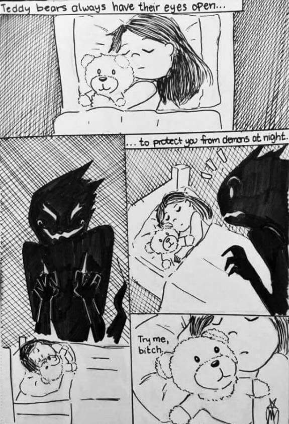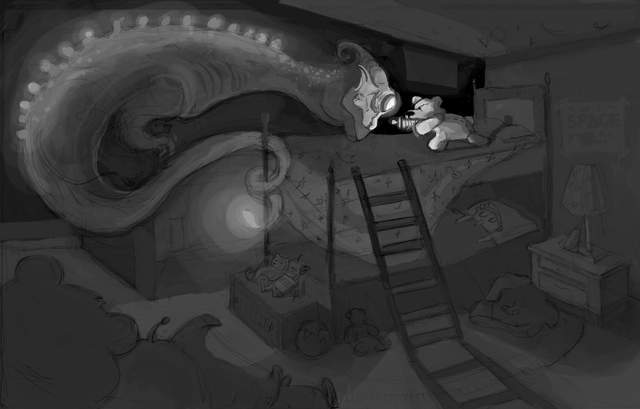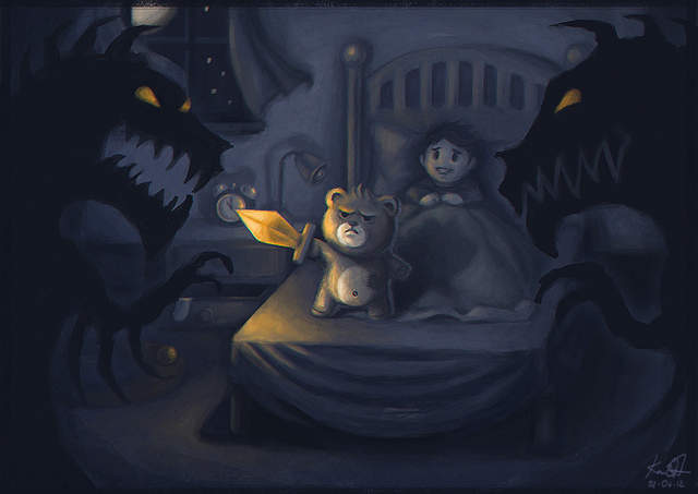 這些插畫打破了現實和童話的界線,你是不是很想回去抱抱床上的娃娃?它們平時非常安靜,在深夜卻會化身勇敢的騎士。怪不得每一天早晨醒來後娃娃都會跑到其他地方,原來它奮力跟怪獸搏鬥,這才移位了!