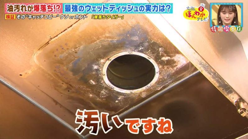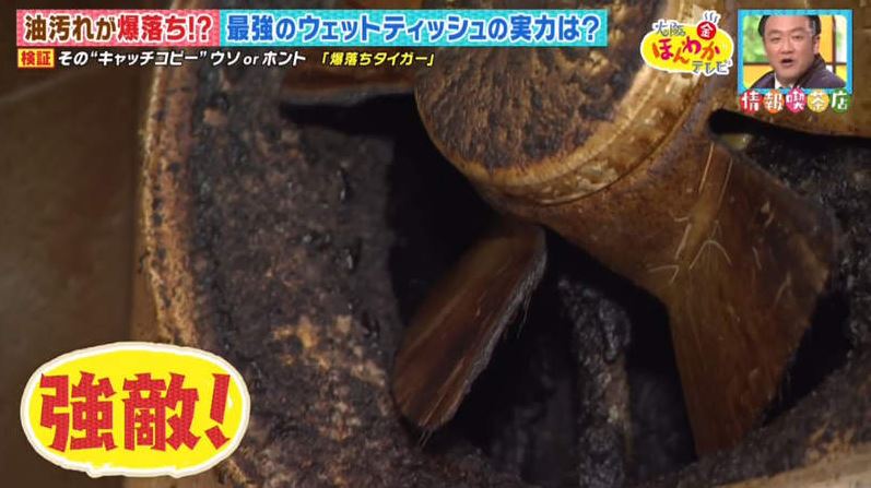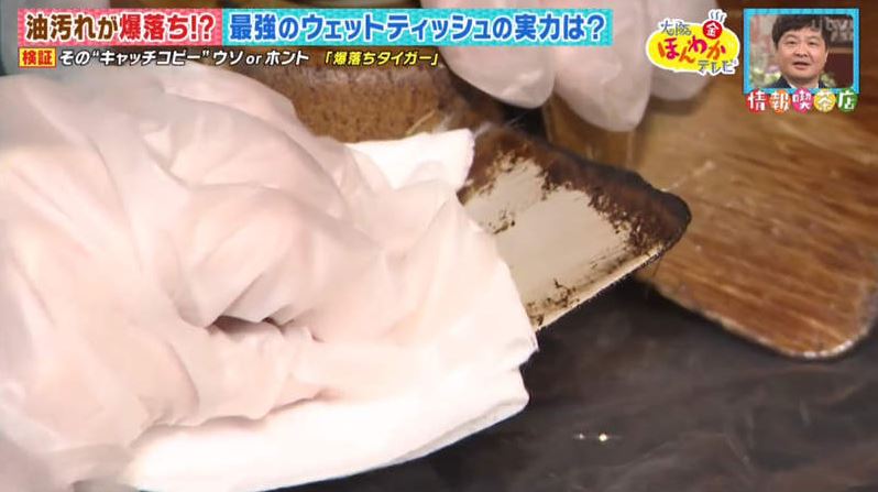 ▼業務解釋說,他們的濕紙巾裡加入了強力分解油脂的成分,在擦拭髒污的過程中還能分解污垢,所以才能輕鬆擦乾淨,清潔力非常強。