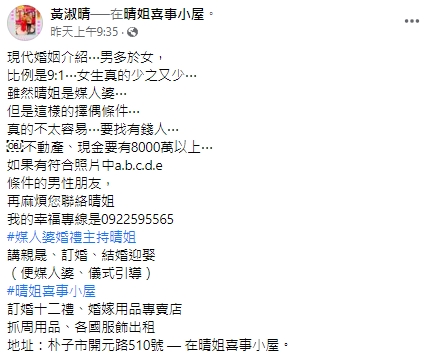2022年05月19日嘉義縣地方知名媒人婆黃淑晴,過去曾配對許多佳偶。最近她在臉書發文說,一名50歲的護理師請她幫忙介紹對象,擇偶條件是要有錢人,而且「不動產、現金要有8000萬以上」,另外還不能太胖、年齡須在70 歲以下等等。這讓黃淑晴覺得很為難,不禁直呼:「真的不太容易…」