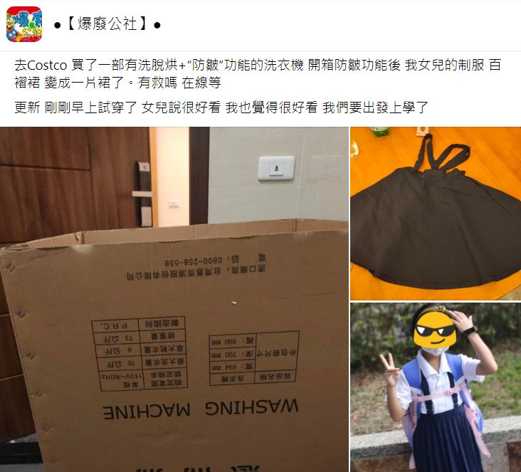 2022年05月18日這台洗衣機的除皺功能太強大了~日前一位爸爸在臉書社團「爆廢公社」發文求救,他在美式賣場好市多(Costco)買了一部有洗烘脫、主打防皺功能的洗衣機。開箱防皺功能之後,他把女兒的制服放進去洗,沒想到洗完拿出來後,百褶裙竟然變成一片裙。他不知道該怎麼辦,連忙上網求助:「有救嗎?在線等。」