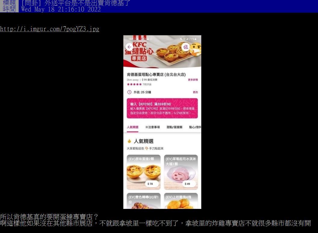 ▼一名網友在PTT以「外送平台是不是出賣肯德基了」為題發文,並貼出一張foodpanda截圖,只見店名寫著「肯德基蛋塔點心專賣店」。他驚訝問:「所以肯德基真的要開蛋撻專賣店?這樣如果沒在其他縣市展店,不就跟拿坡里一樣吃不到了?拿坡里的炸雞專賣店不就很多縣市都沒有開。」