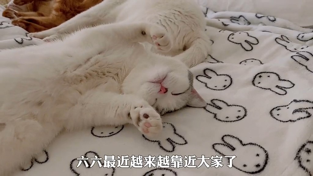 ▼不久之後,在另一個角落的白灰貓「八弟」也跑過來,躺在福妹下方睡覺。牠一邊睡一邊踏踏,看來睡得非常安穩。