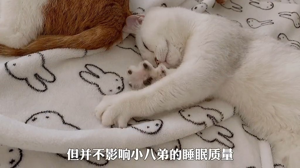 ▼在旁邊互相理毛的橘貓「財哥」和白貓「七七」看到這一幕,也跑過來加入陪睡的行列。因為福妹和財哥佔據了妹妹的手臂,七七只好選擇挨著財哥睡下。