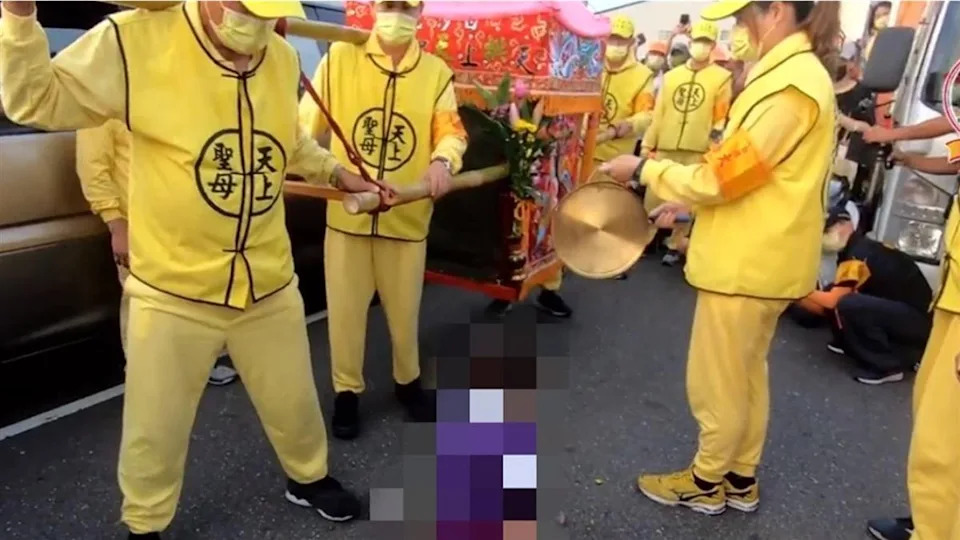▼媽祖鑾轎將轎槓放在男童頭頂,就像媽祖在慈愛地撫摸孩子的頭,這溫馨的一幕非常感人。媽祖鑾轎接著往後停住,母子兩人就跪在路邊,整個過程約5分鐘後,鑾轎隊伍再往前行進。