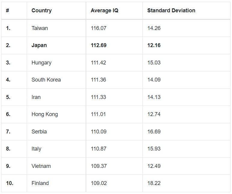 IQ與人們獲取的知識量有關,也和抽象思考、實際運用解決問題息息相關。不同國家和地區智商平均水平的測試結果,會受到人口結構變化影響。Wiqtcom指出,台灣進行測試的人數比較少,似乎只有最優秀的一群人參與,所以測得的平均智商結果可靠性降低。如果台灣有更多人參與測試,結果可能會不一樣。