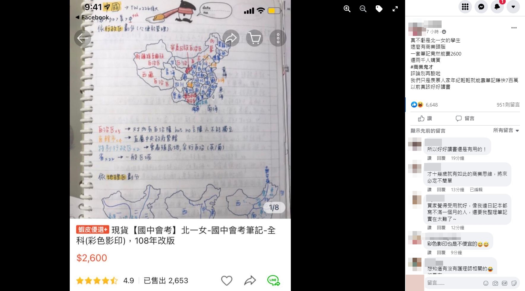 ▼這名北一女學生在蝦皮販售筆記,以「北一女國中會考筆記」斗大字樣為標題,並強調是全麥克筆記、108年新改版,1份全科筆記要價2600元。從商品介紹圖可以看到,筆記條列式結構分析,而且記錄非常詳細,字體工整美觀,地理科目還畫有精美地圖,並用橘色、黃色、藍色各種顏色區分劃出重點,一眼就能看清楚考點。