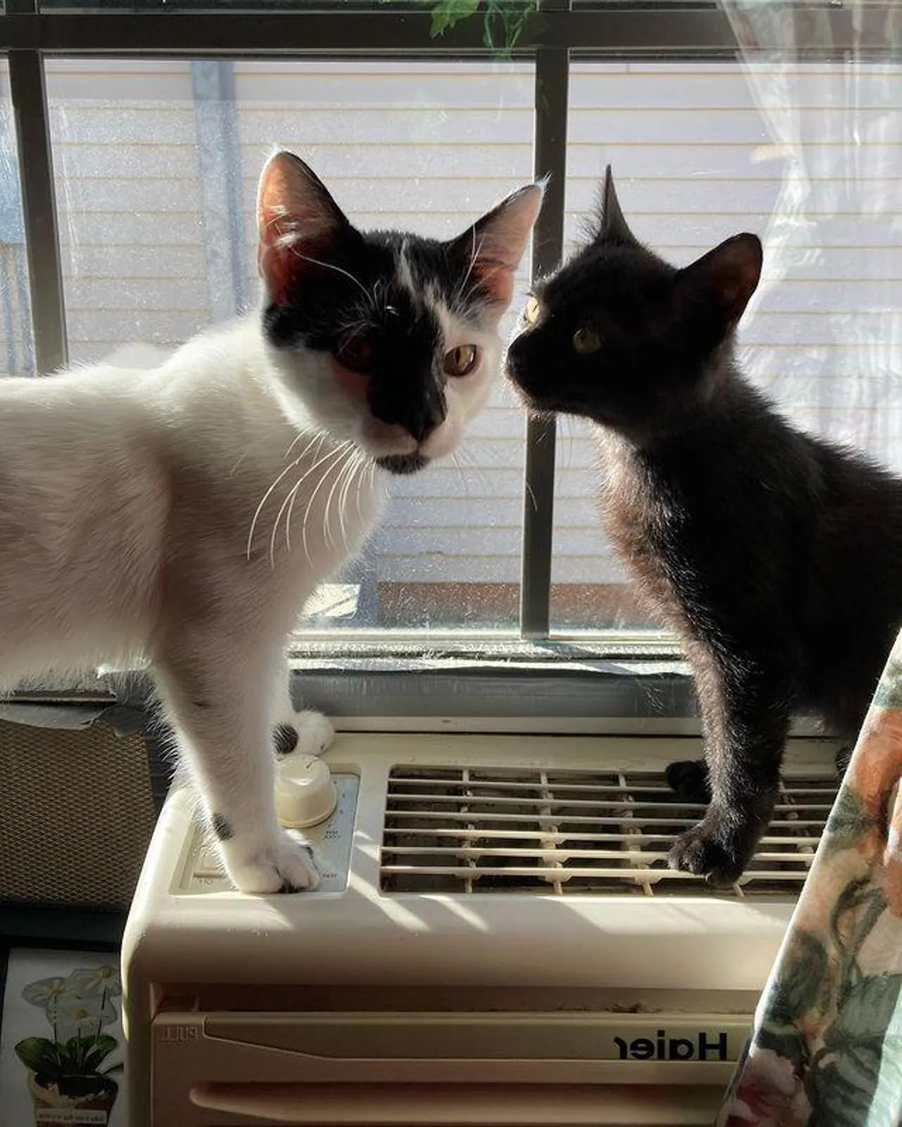 ▼Precious家中原本就有一隻黑白貓咪Mickey,Sweetie對這隻大貓很感興趣,整天追著Mickey跑。兩隻貓咪很快成為了好朋友,一起玩摔角、一起惡作劇。