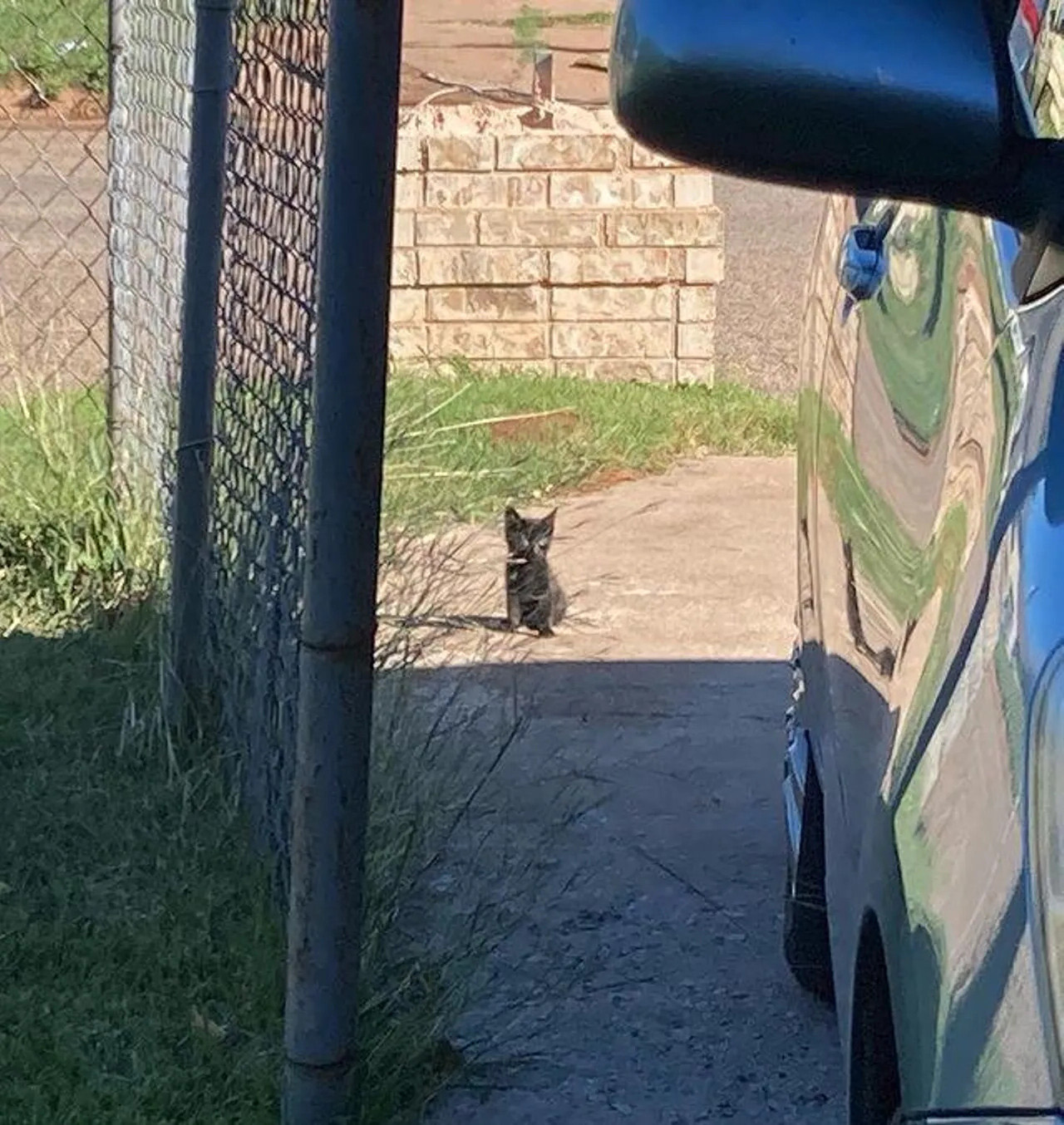 ▼Precious在車道上發現這隻小黑貓時,牠非常虛弱,一隻眼睛因為感染無法睜開,鼻孔也被堵塞,看起來很糟糕。Precious將牠帶回屋,清潔乾淨後又給牠準備食物,但牠已經虛弱到無法自行進食了。