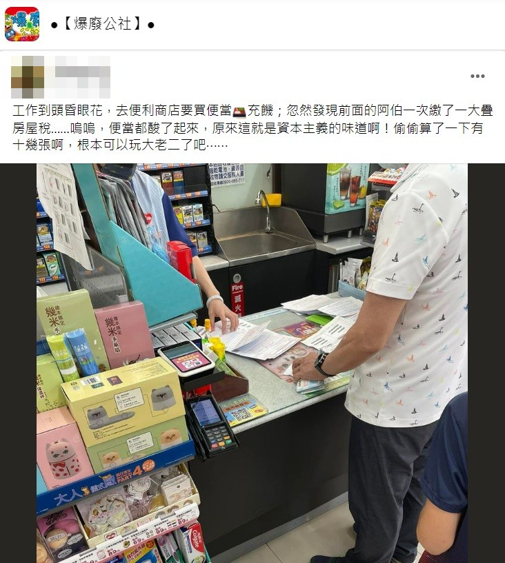 原po表示,那天他工作到頭昏眼花,去便利商店買便當充飢,沒想到排隊結帳時發現前方一名阿伯正在櫃台繳費,而對方手中拿著一堆帳單。原po好奇地看了一下,驚呼「阿伯一次繳了一大疊房屋稅」,估計有十幾張!他見狀不禁鼻酸,說:「嗚嗚,便當都酸了起來,原來這就是資本主義的味道啊!偷偷算了一下有十幾張啊,根本可以玩大老二了吧…」