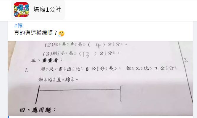 ▼這名網友在臉書社團「爆廢1公社」po出一張照片,上面是一道小二數學題目,請考生「用尺畫出比8公分長,又比7公分短的直線」。原po認為這個描述前後矛盾,令人非常困惑,所以好奇地問大家:「真的有這種線嗎?」