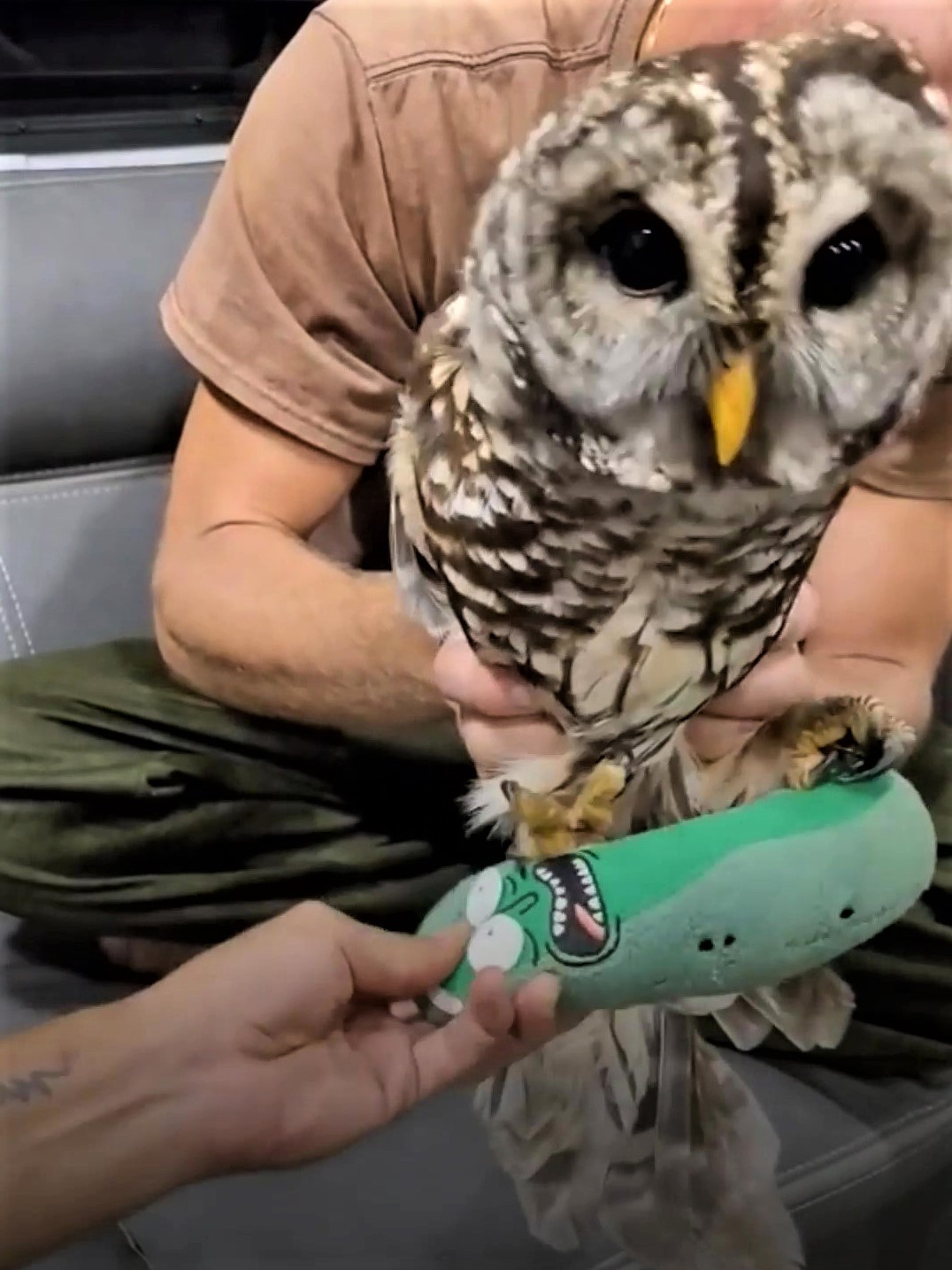 ▼這對夫妻給貓頭鷹取名為KoKo。他們表示,那天他們發現KoKo時,牠就靜靜站在公路邊。看到兩人朝牠走來,牠也沒有像一般野生動物一樣驚慌逃跑,只是睜著眼睛好奇地看著他們。