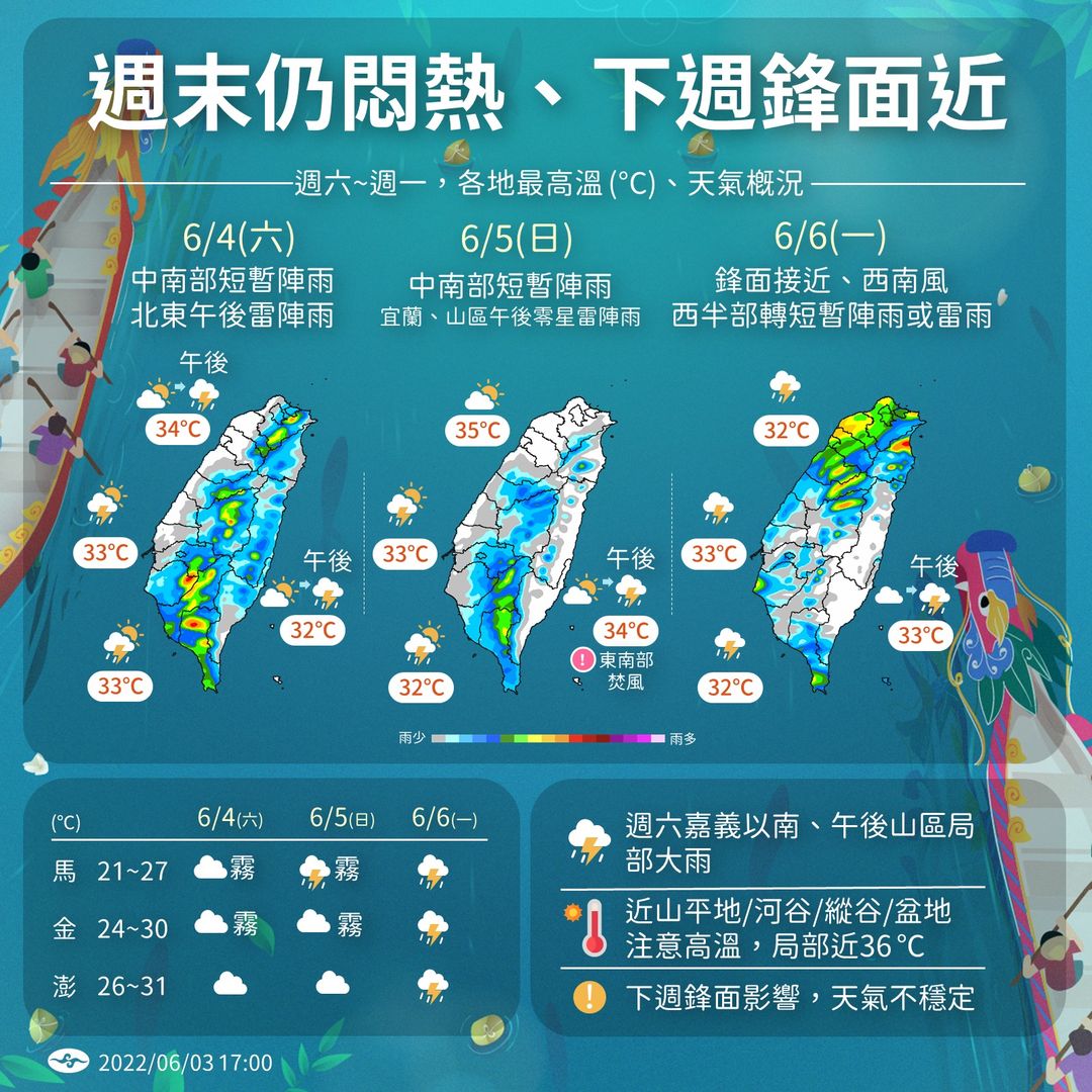 2022年06月04日端午連假到來,各地持續熱如盛夏,高溫在攝氏35、36度左右,但馬上就要變天了!今天(4日)西南風所伴隨的水氣較多,整天有不定時局部短暫陣雨或雷雨,其他地區為多雲到晴,午後局部地區亦有短暫雷陣雨。下週北部白天氣溫恐降至25度,相差近9度!
