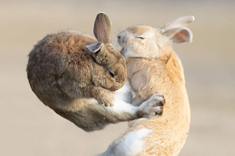 ▼從照片中可以看到,這2隻兔兔騰空而起,其中一隻踢腿發動攻擊,另一隻則後退防禦。攝影師捕捉到這珍貴的瞬間,把牠們勢均力敵的對抗拍攝了下來,一眼看去就像電影中的武打戲,充滿力量和美感
