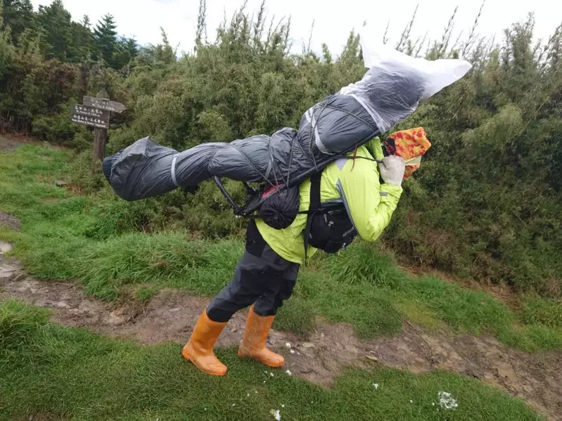 ▼協作員第一時間用睡袋包裹,將劉女遺體搬到桃山山屋,避免曝屍山野。雪霸處武陵站巡山員賴輝銘、台中市政府消防局8人、林務局東勢林區管處梨山工作站護管員3人,9日上午8時在桃山登山口會合出發,協作員田瑋業、田宇軒、全仁凱,同時從桃山山屋背負大體下山。