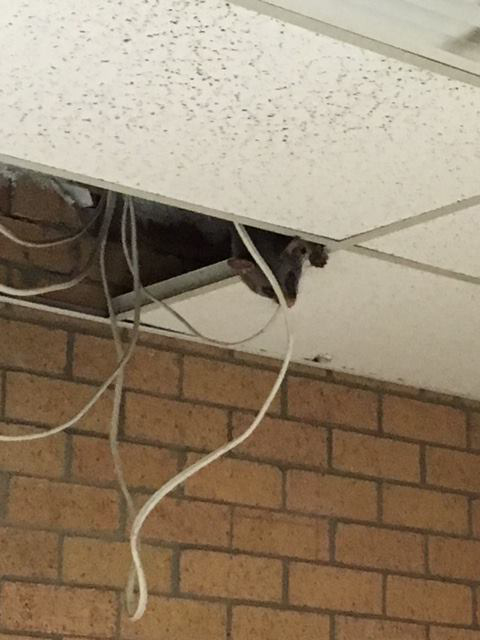 ▼這名學生將負鼠躲在教室天花板的照片po到網路上,並說:「這隻負鼠正在看著上課的學生們。這傢伙經常出現在這裡。」