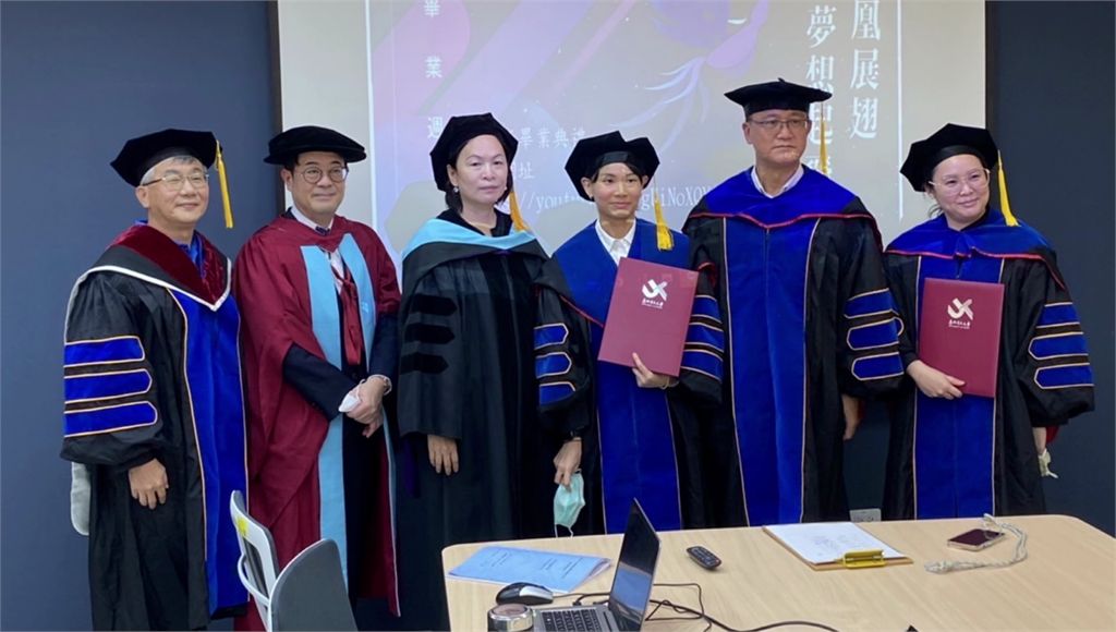 ▼北市大競技運動訓練研究所13日舉行畢業典禮。戴資穎正在備戰本週的超級1000印尼羽球公開賽,之前已經前往雅加達。她在出國前往印尼的前一天,在國訓中心幫忙下,完成了最後的博士論文口試審查,並提前穿上了畢業的博士服,由前校長戴遐齡完成撥穗儀式,再由現任代理署長教育部次長林騰蛟頒發博士學位畢業證書,最後由現任代理校長邱英浩頒發特別貢獻獎。