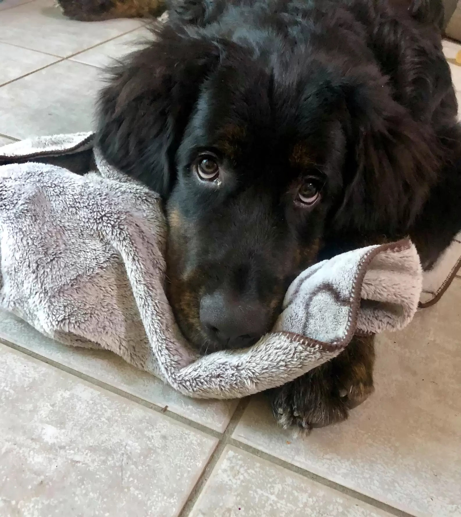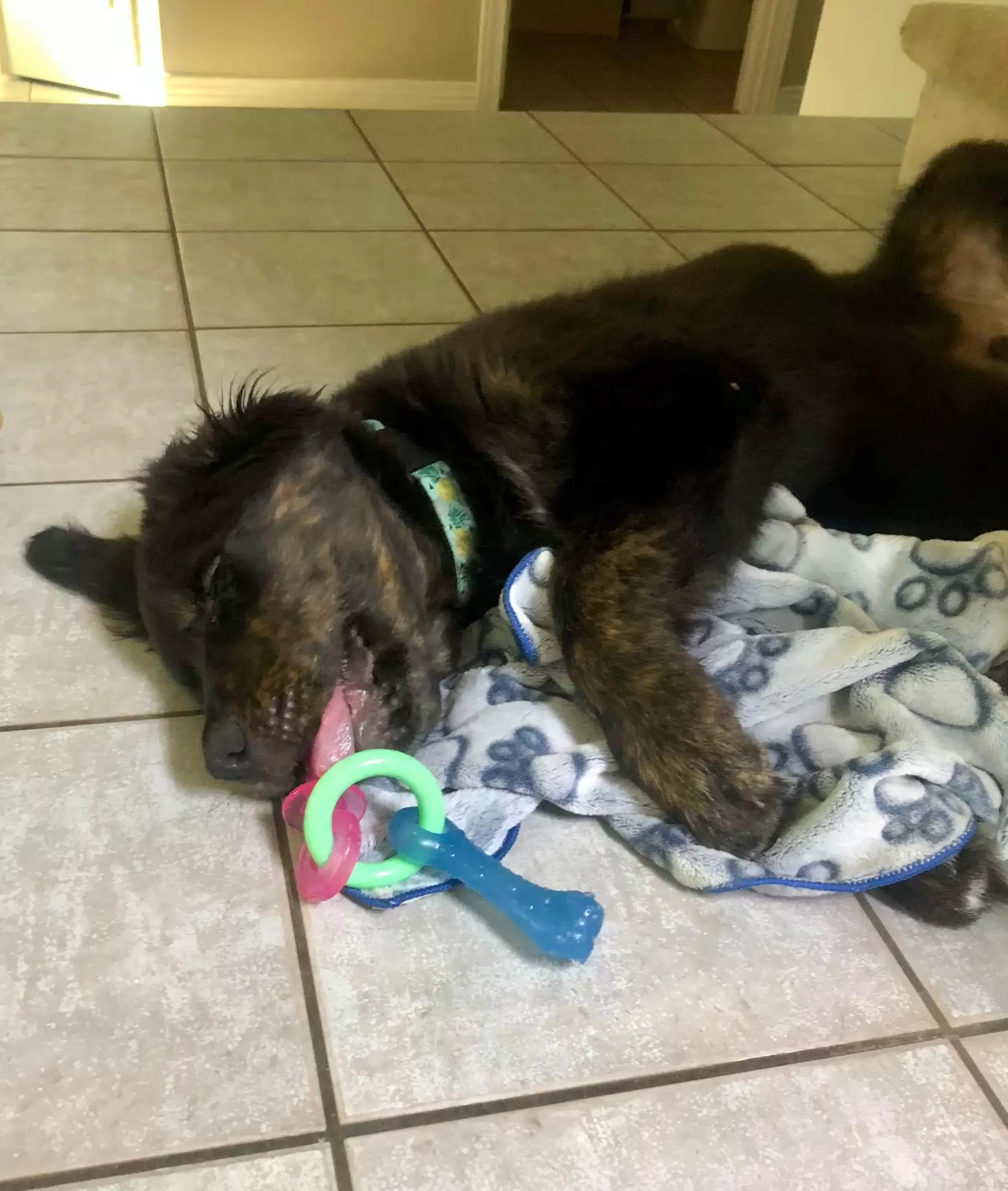 ▼1年半前,Shauna在商店隨手買了一條小毛毯回家,本想拿來給Flynn擦腳,沒想到Flynn把毛毯叼到自己的窩裡,抱著它進入夢鄉。從此之後,Flynn每天都叼著這條小被被到處趴趴走,出門散步的時候也要帶著它。