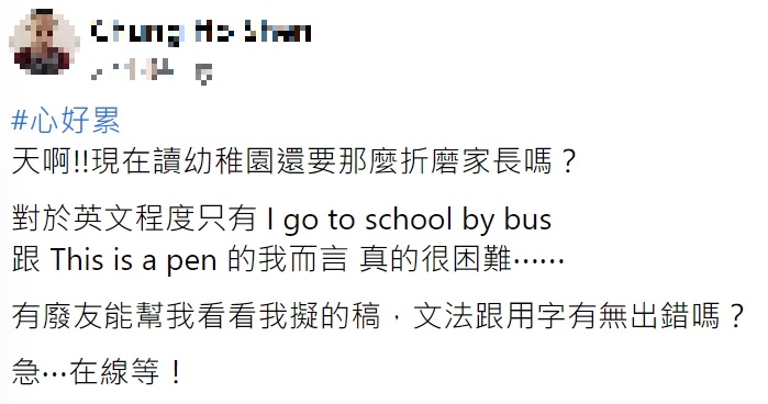 ▼原po看到學校交代的事項直呼:「天啊,現在讀幼兒園還要那麼折磨家長嗎?對於英文程度只有I go to school by bus.跟This is a pen.的我而言,真的很困難。」他默默擬出短稿,並向網友們求救:「能幫我看看我擬的稿,文法跟用字有無出錯嗎?急…在線等。」