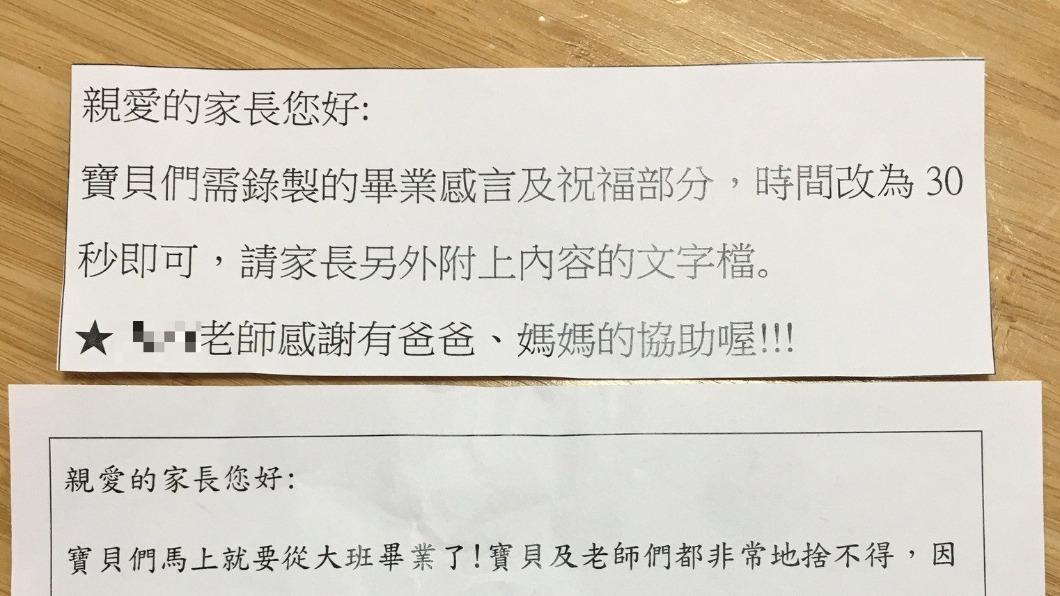 ▼原po在臉書社團「爆廢公社」發文說,小孩就要從幼稚園大班畢業,學校要求家長協助孩子錄製一段感言及祝福,全程都要以英文表達,原本規定要1分鐘,後來改成了30秒,另外還要附上文字檔,然後還要再提供一張電子檔的嬰兒照。