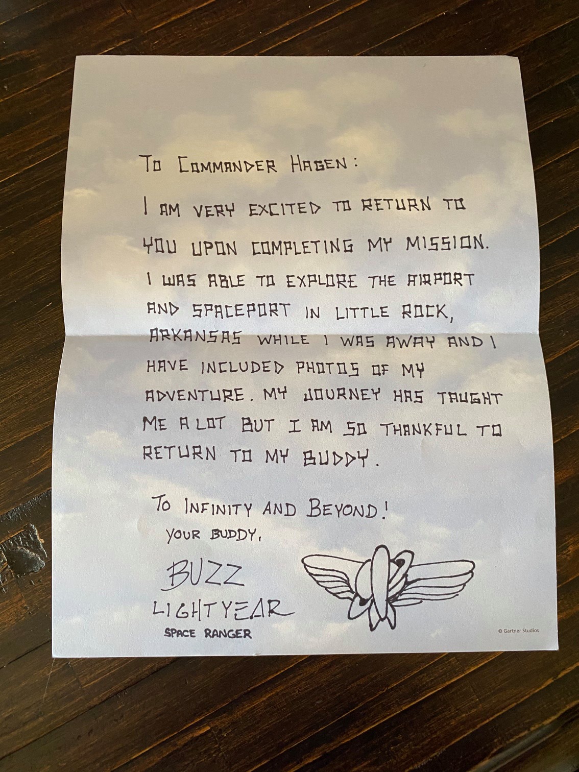 ▼包裹裡還有一封手寫信:「致Hagen總指揮官,非常高興能在完成任務後回到您身邊,在我離開的這段時間,我完成了在阿肯色州小石城機場與太空發射站的探險。這趟旅程教會我許多事物,我非常感謝能重新回到我的夥伴身邊。」文末寫有巴斯光年的招牌台詞:「飛向宇宙,浩瀚無垠!」