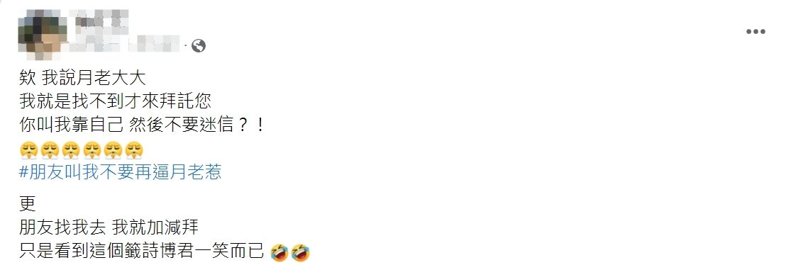 ▼原po看到籤詩後一頭霧水,直呼:「我就是找不到才來拜月老啊,沒想到叫我靠自己。」網友們也紛紛笑說:「連月老都不想幫忙,到底多慘」、「男人求姻緣是找財神,女人求姻緣是找月老,你搞錯重點了」、「您的月老已下線」、「月老說:這單太硬,先不要接」、「叫你不要拉低成功的平均值啦」。