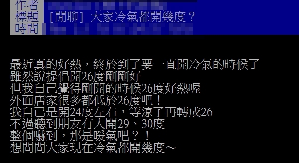 ▼這名網友以「大家冷氣都開幾度?」為題發文說,最近天氣好熱,終於來到一直開冷氣的時刻。雖然外界提倡開26度剛好,但他認為設定為26度還是非常熱,因此他往往都會先將溫度調到24度,等室內溫度降低再調成26度。