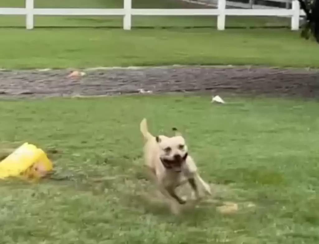 ▼Rambo來到寄養家庭的第二天,就跑不及待跑到院子裡玩耍。當時天空中下著雨,牠卻毫不在乎,面帶笑容在草地上狂奔。收容所的志工Julie Saraceno說:「從牠的眼睛中能看到滿滿的喜悅,牠真的很享受自由的感覺!」