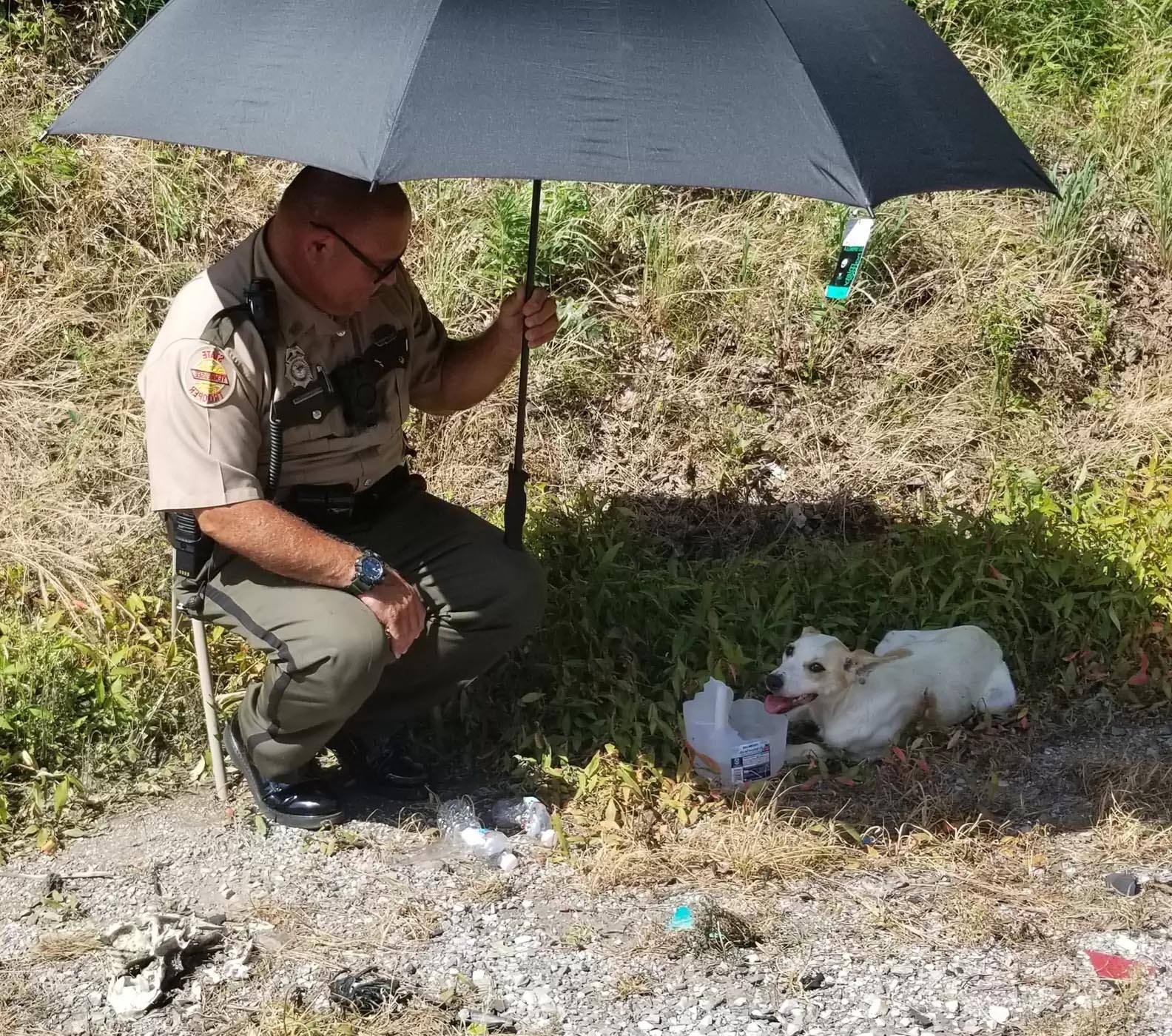 ▼當時天氣太炎熱,員警通知動物控制中心後,先裝來一些水給狗狗喝。等待相關人員到場期間,員警直接坐到狗狗旁邊,撐傘幫牠遮陽,那一幕非常感人。