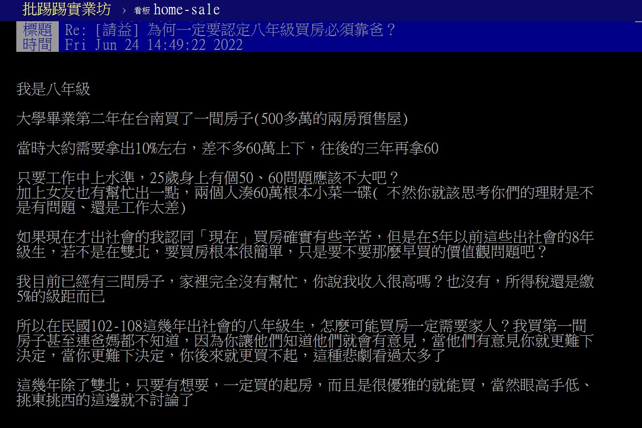 這名網友在PTT發文說,他是8年級生,大學畢業2年後就在台南買到一間500多萬的2房預售屋。當時需要拿出10%左右,大約60萬,之後3年再拿60萬元。對此,他分析說,買房對8年級生來說不難,只要工作有中上水準,25歲應該都會有5、60萬存款,再加上另一半幫忙,「兩個人湊60萬根本小菜一碟」。