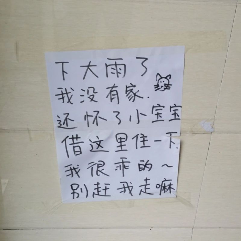 ▼原po表示,最近天公不作美,連續下了2天大雨。她很擔心那隻懷孕的浪貓,但在樓梯口看到了一張貼在牆壁上的「公告」。原來有人以貓咪的口吻,替那隻浪貓寫了「貓媽媽公告」:「下大雨了,我沒有家!還懷了小寶寶,借這裡住一下,我很乖的~不要趕我走嘛。」