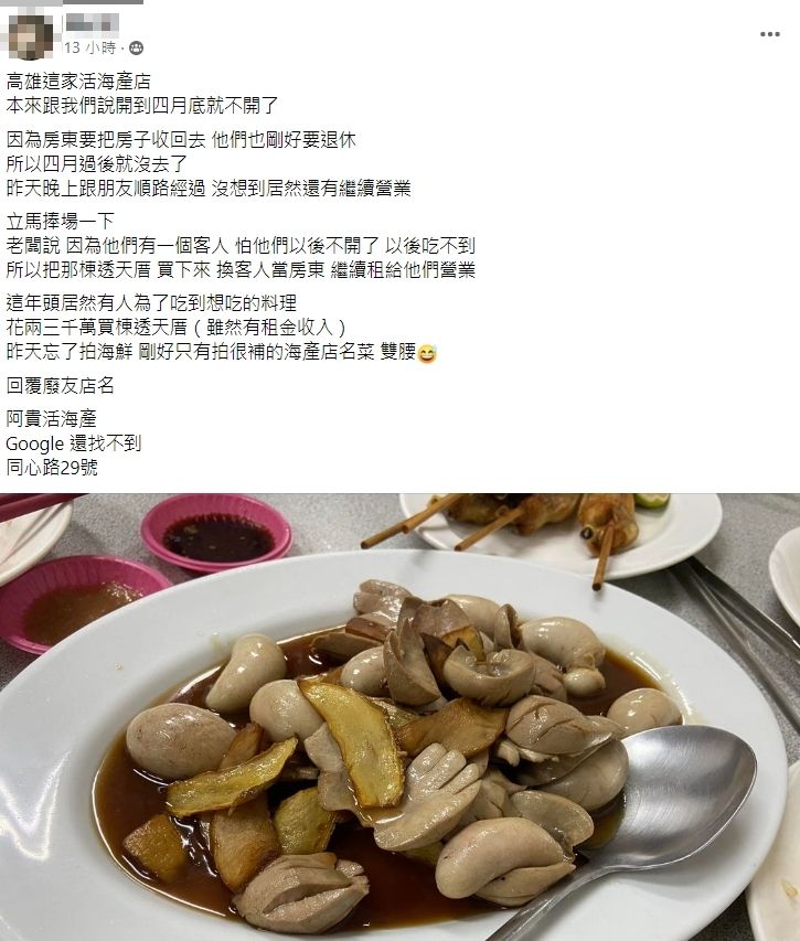 原po在臉書社團「爆廢公社」發文說,自己經常吃的一家海產店,因為房東要把房子收回去,再加上老闆剛好要退休,因此決定開到4月底就不開了。沒想到幾個月後他路過時,發現店面還在營業,於是立刻進店捧場。