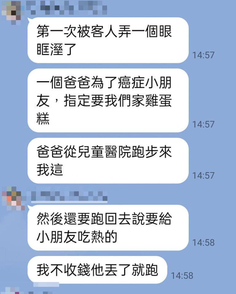 ▼一名網友在臉書社團「爆怨公社」分享LINE截圖對話,她透露一名從嘉義來的年輕爸爸多次帶罹癌的女兒到台大醫院兒童醫院治療,同病房的病友曾請林小妹吃過永康街的雞蛋糕,之後林小妹就對這味道念念不忘。這次父女兩人再次來台北,林小妹就指定要吃永康街的雞蛋糕。