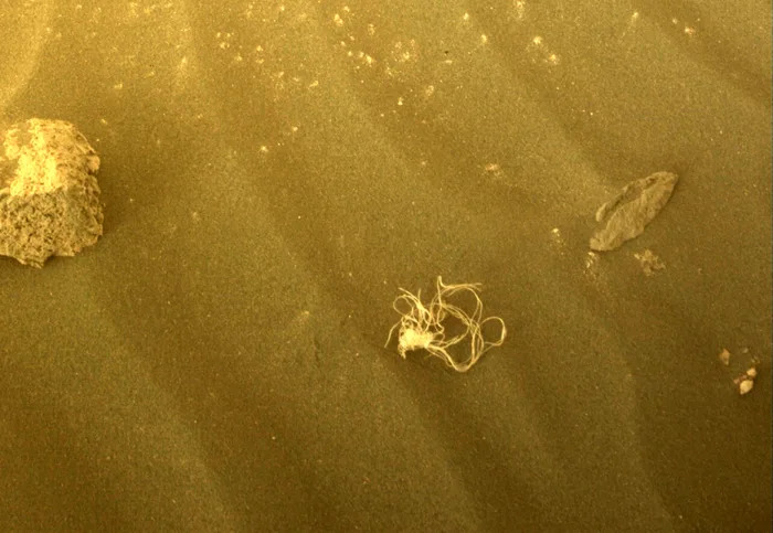 ▼NASA表示,研究人員分析認為,這個神秘的線團是毅力號著陸過程中留下的一段繩索。因為毅力號此前沒有到過這片區域,所以線團很可能是被風吹到這一位置的。根據NASA近日發布的照片,毅力號4天後(7月16日)再次經過同一位置時,線團已經不見了。