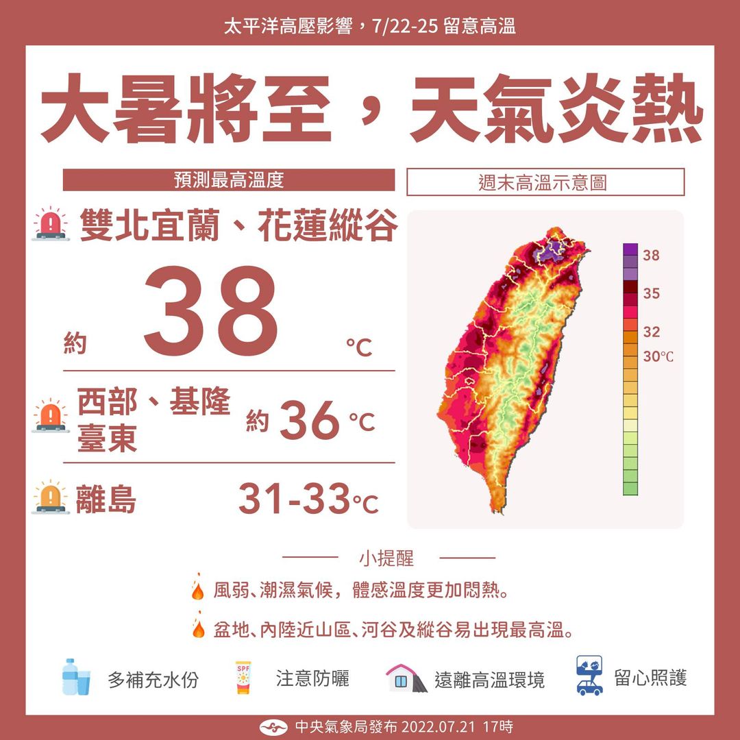 ▼全台各地高溫炎熱,今天起至下週一最酷熱,須嚴防極端高溫出現。雙北宜蘭、花東縱谷高溫可能達38度以上,其他縣市的內陸河谷也易有極端高溫。下週二、下週三(26、27日) 太平洋高壓盤據但稍稍減弱,高溫在34、35度,局部36度,仍然悶熱,但午後雷雨稍擴增至西半部近山區平地。