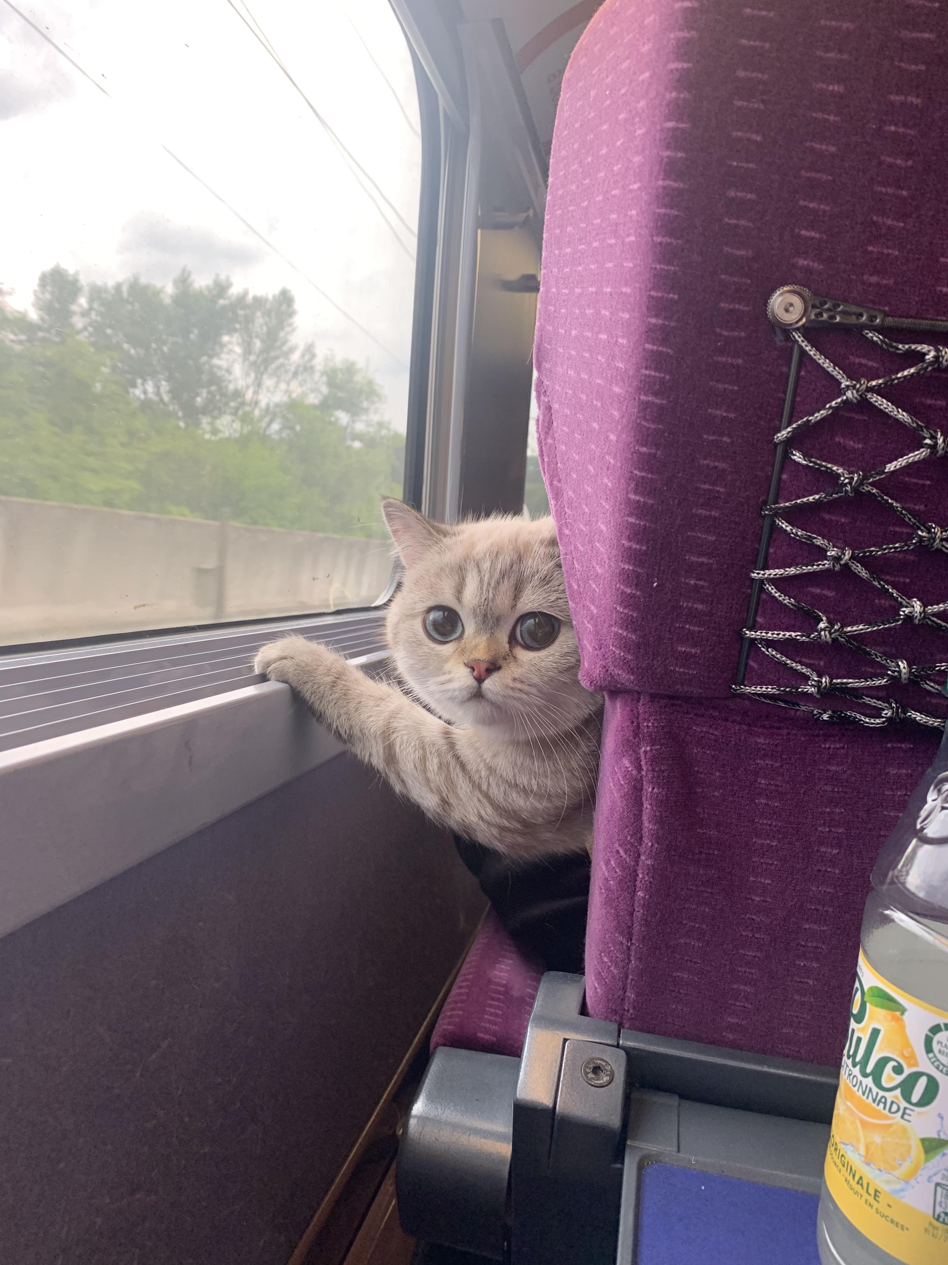 ▼網友「u/Pardonmyfuckinfrench」在網路論壇Reddit上貼出一張照片,並表示他日前搭火車時,不小心踢到前座乘客的椅背。正當他要出聲道歉時,前座的乘客突然轉過頭來,一臉怒氣地瞪著他。不過這位乘客不是人,而是一隻可愛的橘貓。