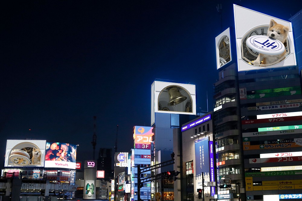 2022年08月05日日本新宿的「3D裸視三花貓」在網路上討論度很高,現在東京澀谷也出現3D秋田犬了!超巨大的3D秋田犬裸視報時廣告(秋田犬3Dカラクリ時計)出現在大樓上,秋田犬在不同大樓之間跳躍穿梭,那活潑可愛的模樣吸引了路人的目光。
