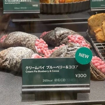▼原po將這款甜點的照片po到PTT,並說:「日本星巴克推出新產品,被嫌像福壽螺卵。」這款甜點名為「クリームパイ ブルーベリー&ココア」,售價含稅300日圓,作法是「可可酥皮配上藍莓奶油,上面點綴加了藍莓的巧克力球」,聽起來很美味,但外型實在太可怕。
