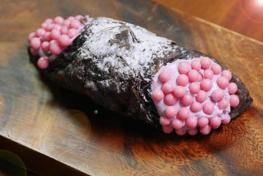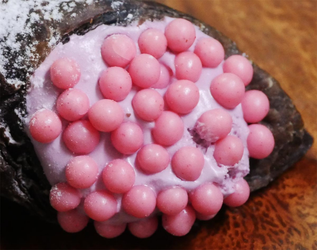 ▼從照片中可以看到,這款甜點的兩側是一顆一顆的粉紅巧克力球,因為數量太多擠成一團,搭配黏黏的奶油,乍看之下真的有點噁心。網友們紛紛表示:「這什麼克蘇魯食物」、「不能只有我看到」、「日本美學是不超越台灣了」、「藍莓奶油為什麼長這樣」、「內部評選怎麼過關的」、「就是福壽螺的蛋啊」、「有夠像XD,被罵自找的」、「看完真的覺得不舒服」;也有人能夠接受:「還好啦」、「粉紅色的納豆」。