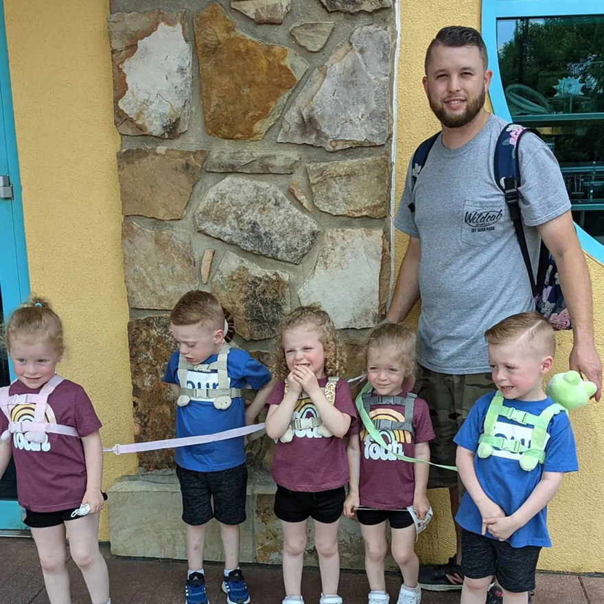 2022年08月08日美國肯塔基州(Kentucky)31歲男子Jordan Driskell是5個小孩的爸爸。最近他帶5胞胎外出散步的影片在網路上引發討論。從影片中可以看到,Jordan給小孩們準備了防走失包,他牽著繩子的一端走在後面,5個孩子則走在前面。一些網友看到影片後批評說:「根本是把小孩當狗遛!」