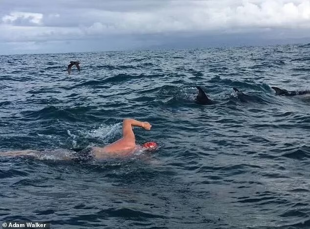 ▼Walker曾在2014年時挑戰穿越25公里長的紐西蘭庫克海峽(Cook Strait)。途中他發現有一隻約2公尺長的鯊魚游在他的下方,正當他擔憂自己的安全時,一群海豚出現並與他伴游1個多小時。Walker說:「我想牠們在保護我、引導我回家,這次的經驗永生難忘。」