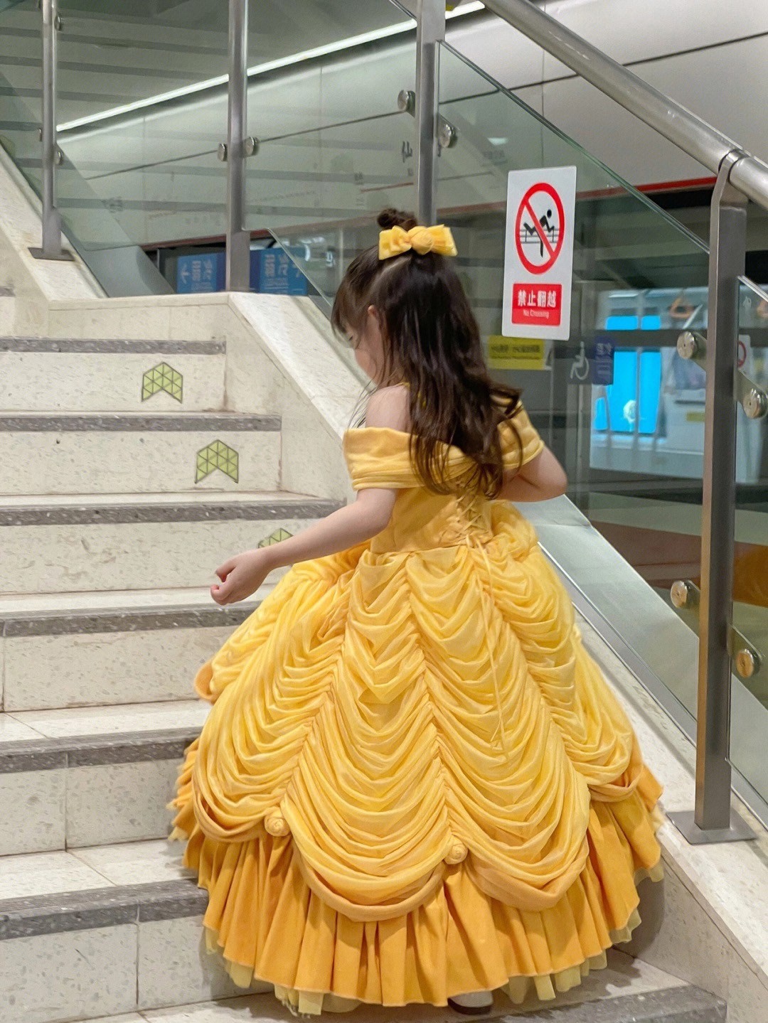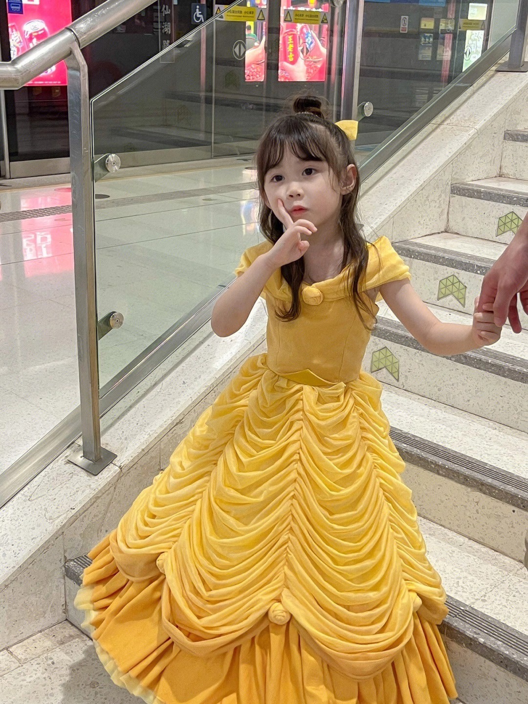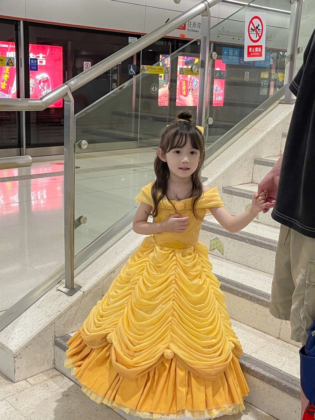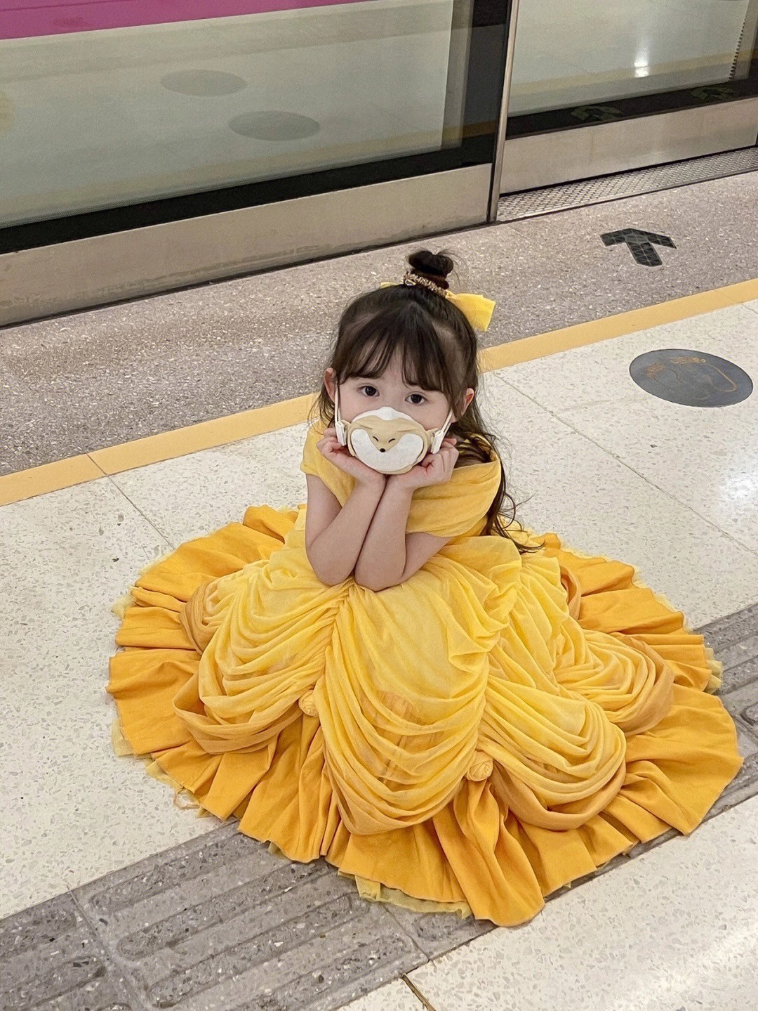▼小紅書帳號「@阿NO阿NO」經常會分享這個小女孩的變裝照。最近小女孩裝扮成貝兒公主,出現在地鐵上的照片在網路上引發話題。只見她身穿貝兒公主的黃色禮服,頭髮也梳成甜美的公主頭,整體看起來非常可愛。雖然她戴著口罩,但能看到又大又亮的眼睛,還有精緻的小臉蛋。