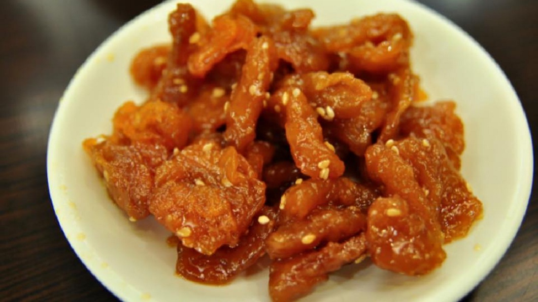 除了「豆棗」之外,還有另外一種「紅紅甜甜的」、常會搭配稀飯吃的食物。這種食物的顏色是鮮紅色,形狀是細絲狀,吃壽司時經常會看到它。這種食物台語唸「ㄉㄠˇㄍㄧ」,中文叫做「豆枝」。很多民眾經常將這2種食物搞混,其實兩者的外觀還是有很大不同的~