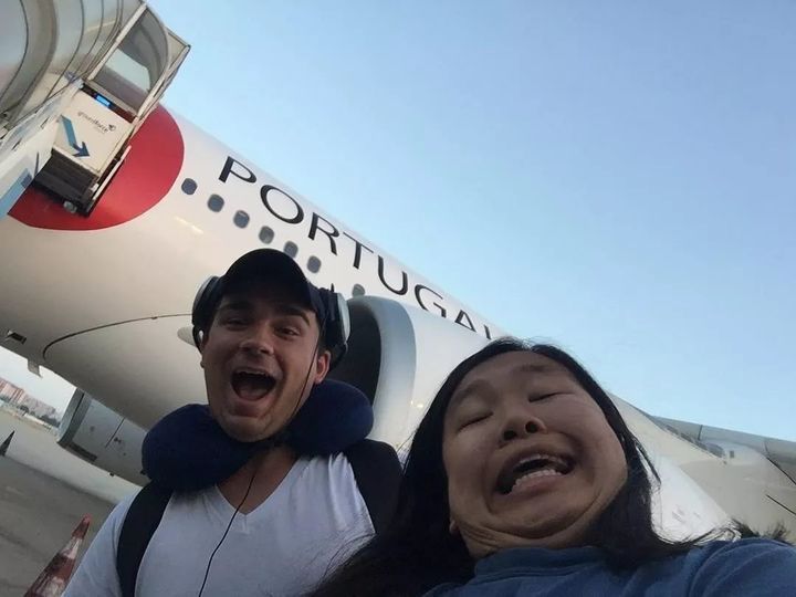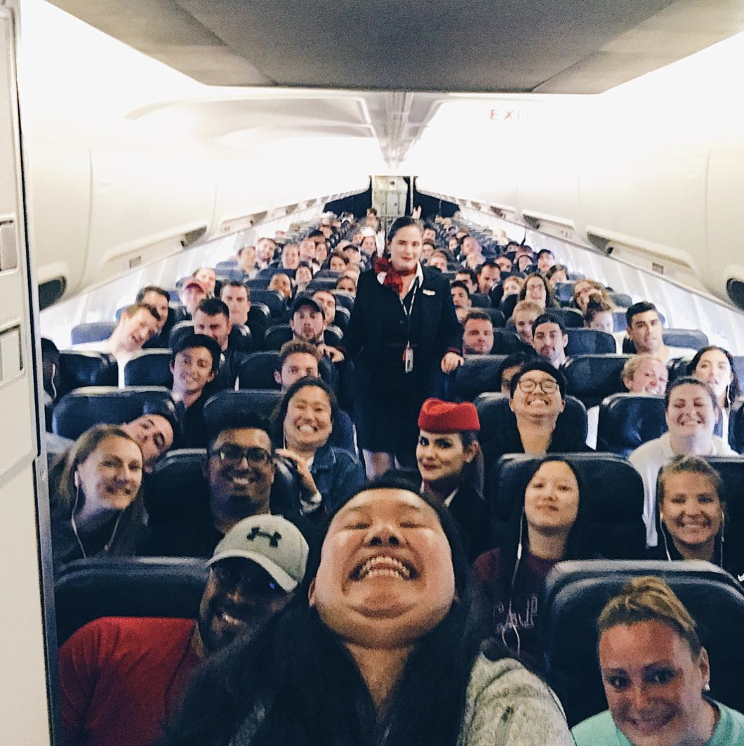▼Michelle的雙下巴旅遊照太受歡迎,有一次她搭飛機準備前往下一個旅遊目的地時,邀請同機的所有旅客一起自拍,這些來自五湖四海的陌生人一起擠出雙下巴,露出開心的笑容,那畫面超有趣!