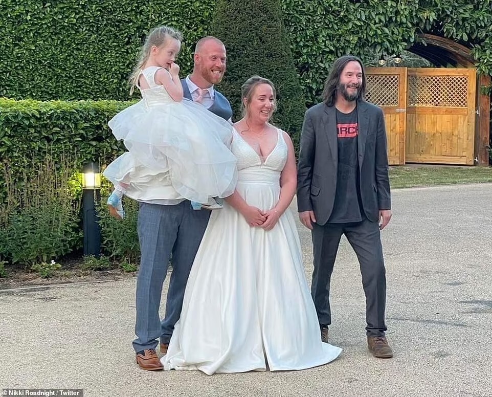▼這對夫妻在北安普敦郡的福利斯大廳酒店(Fawsley Hall Hotel)舉辦婚禮。丈夫在飯店酒吧偶遇基努李維,他和妻子都是基努李維的粉絲,於是請侍者幫忙轉達,想邀請基努李維喝一杯。基努李維欣然同意,他態度友善,與新郎聊天時說,自己剛剛下飛機,只是短暫入住。