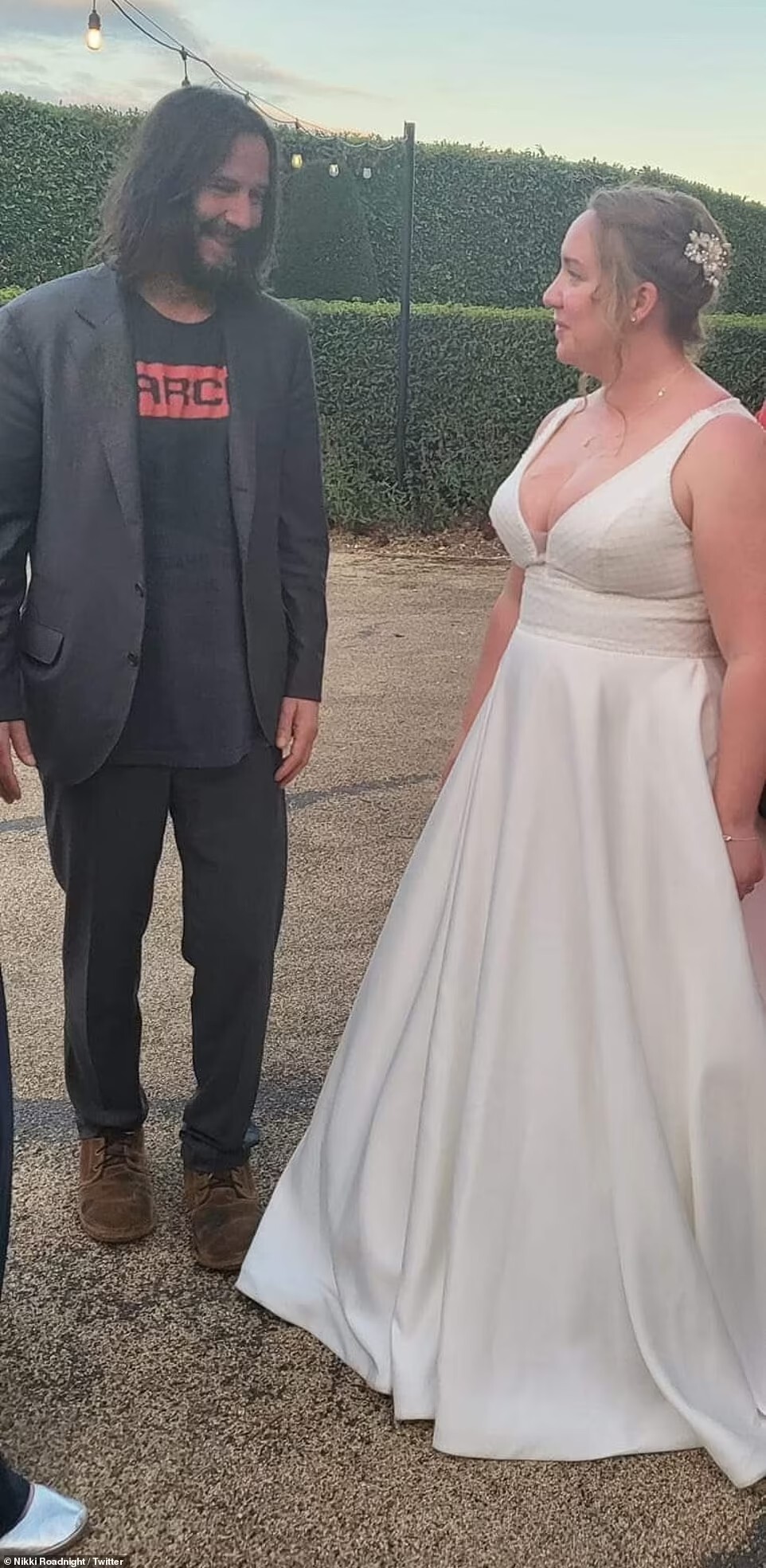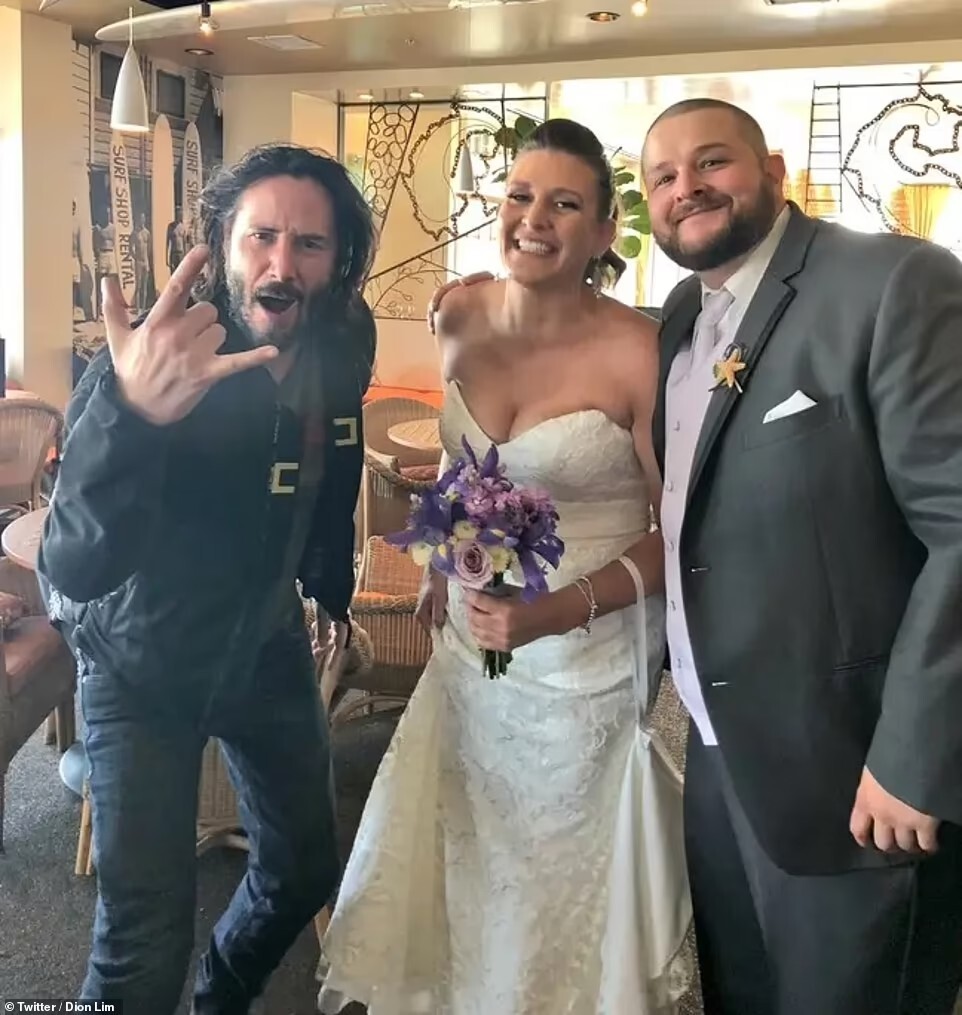 ▼新郎進一步詢問「你願意來我們的婚禮嗎?」他本來只是試著問一下,沒有抱希望,沒想到基努李維答應了,而且1小時後真的依約出現在婚禮現場!新娘激動說:「基努李維沒有馬上離開,還在現場和我們的賓客們互動。」基努李維在婚禮現場待了10多分鐘,全程都非常親切,對賓客們合照的要求也是照單全收。